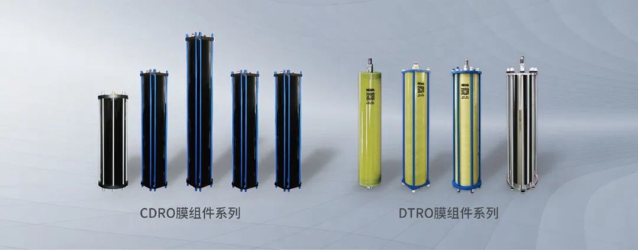 CD膜組件采用特殊的開放式流道設計,由碟片式膜片、導流盤、中心拉桿、耐壓膜殼等組成。原水從膜殼與導流盤間隙中自上而下流入,通過下端進水盤開口,進入導流盤,在導流盤與膜片之間以雷達掃描方式流動。原水遇到導流盤上的凸點形成湍流,具有沖刷自凈功能。原水從投幣式切口進入下一組導流盤和膜片,依次循環流動,在整個膜柱內呈渦流螺旋狀。在壓力作用下,水分子透過膜片,通過內部中心管流出形成產水。